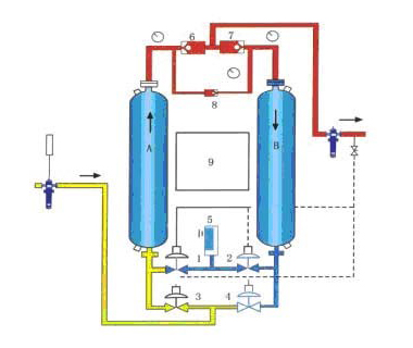 其中: A、B 吸附塔;1、2、3、4 切換閥;5 消聲器;6、7 止回閥;8 節(jié)流閥;9 程序控制器
